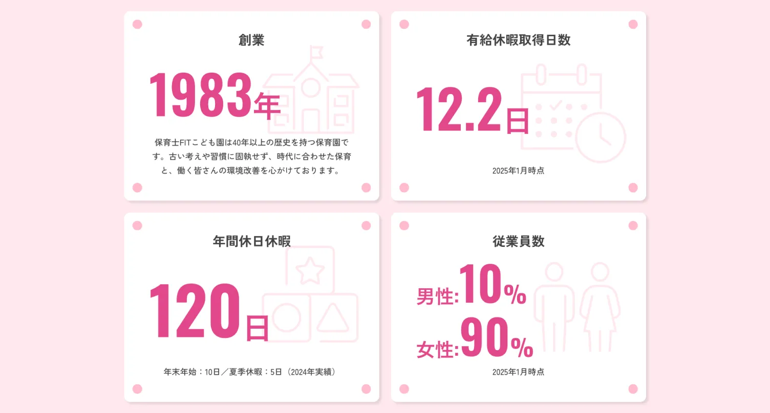 特に「残業の少なさ」「人間関係の良さ」「有給の取りやすさ」など、求職者にとって働きやすさに直結する内容を重視しています。